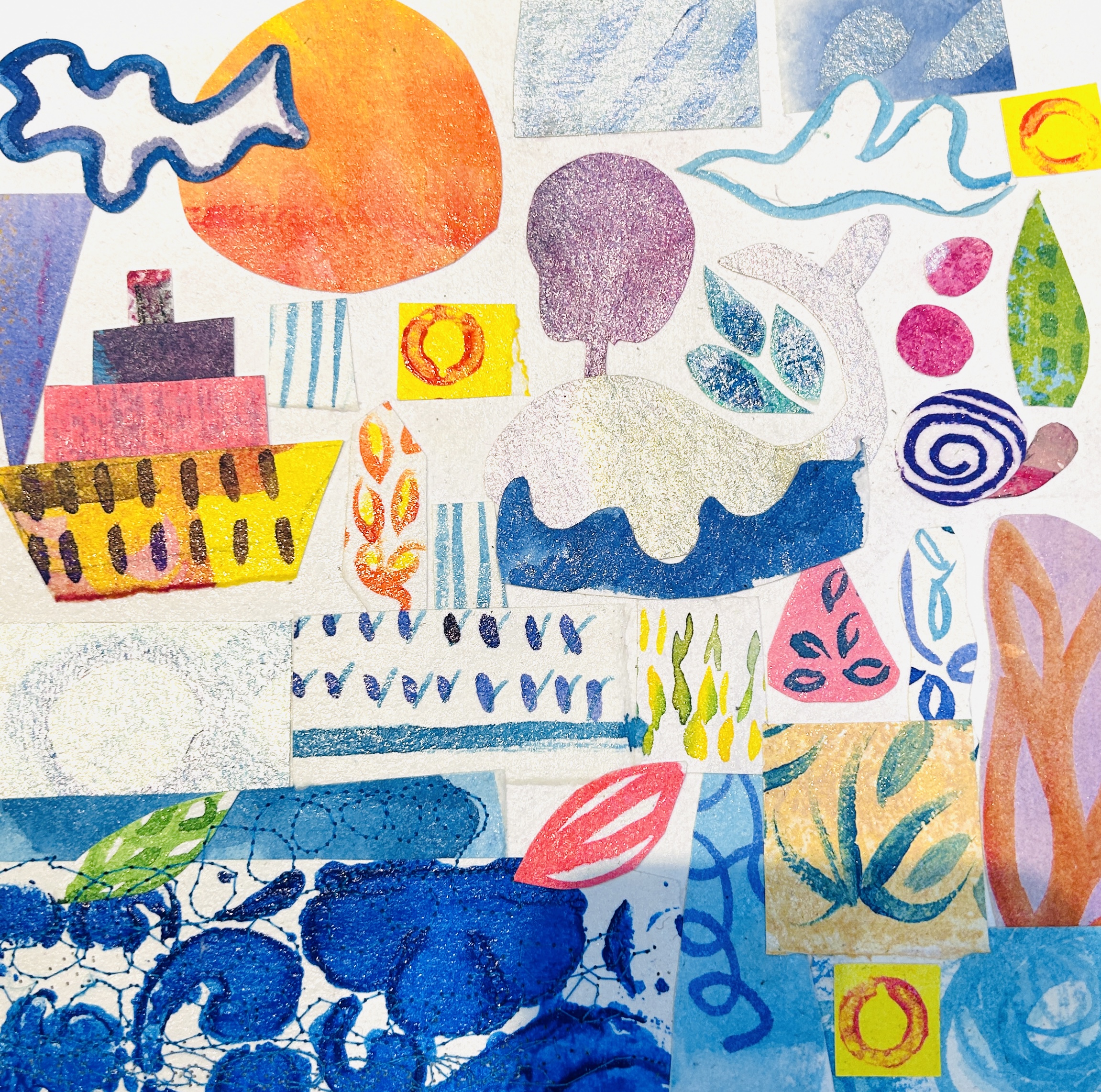 You will be provided with a wide range of plain and patterned paper made by me. A playful collage is created and glued in place on the backing rag paper. Modge podge is used to seal.