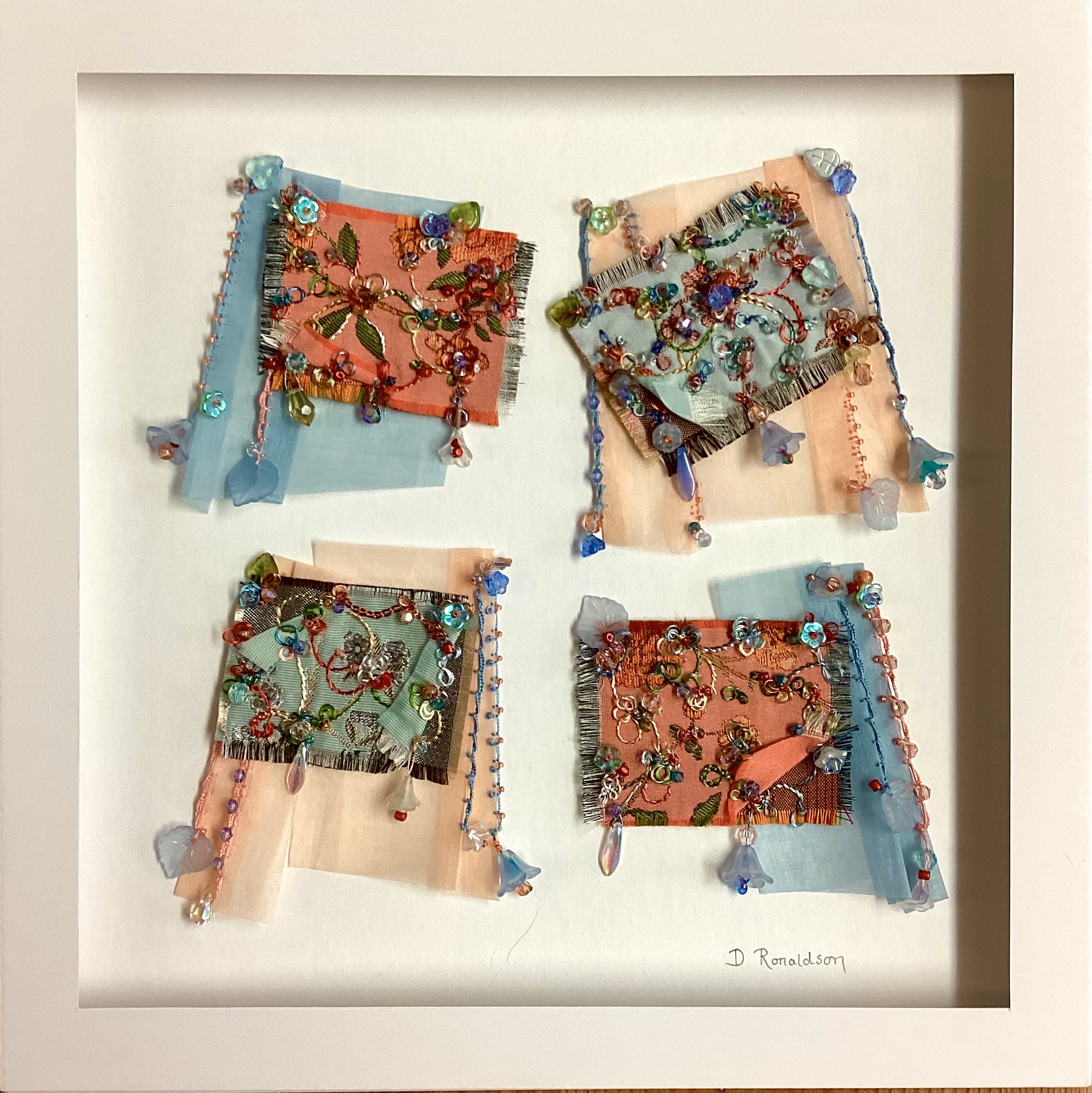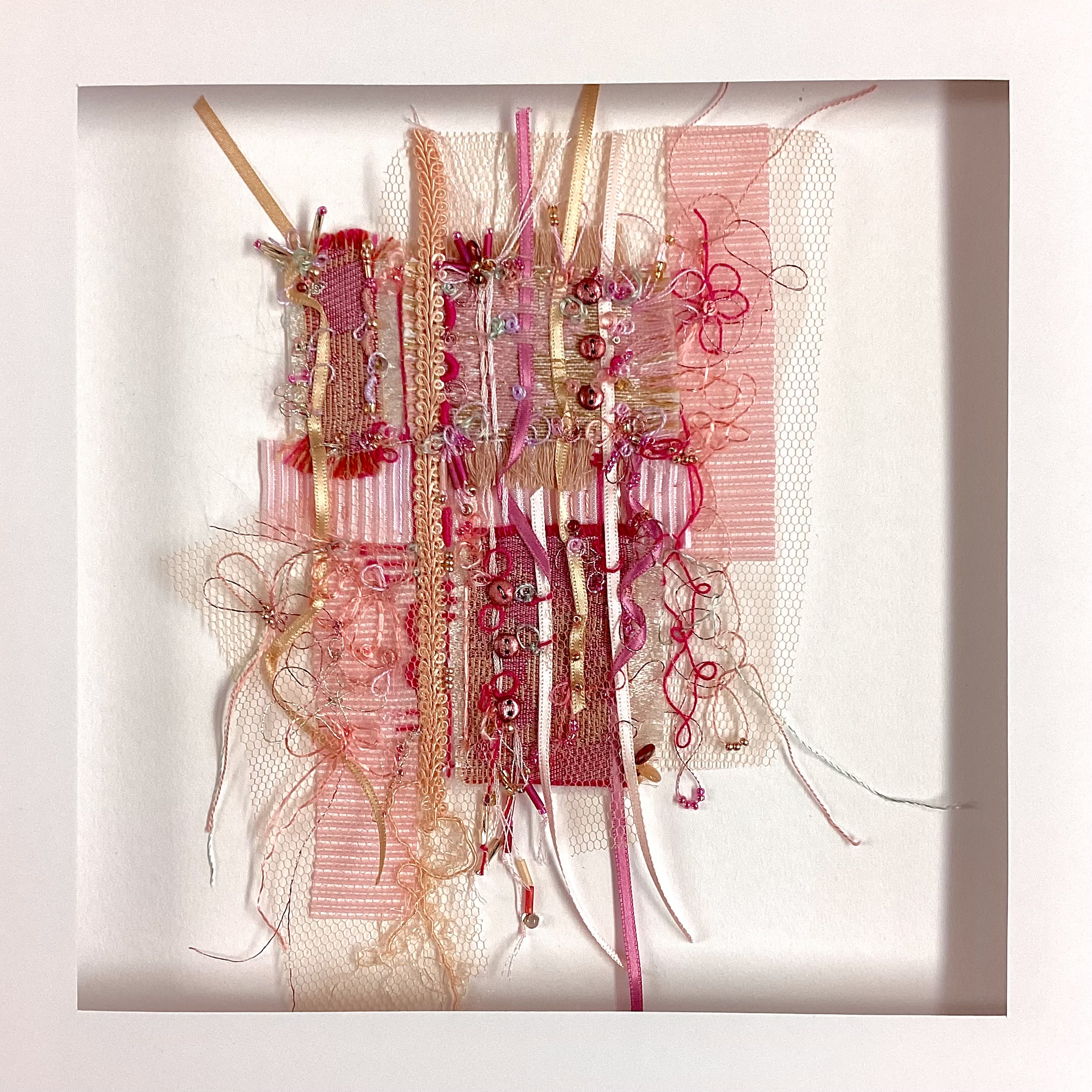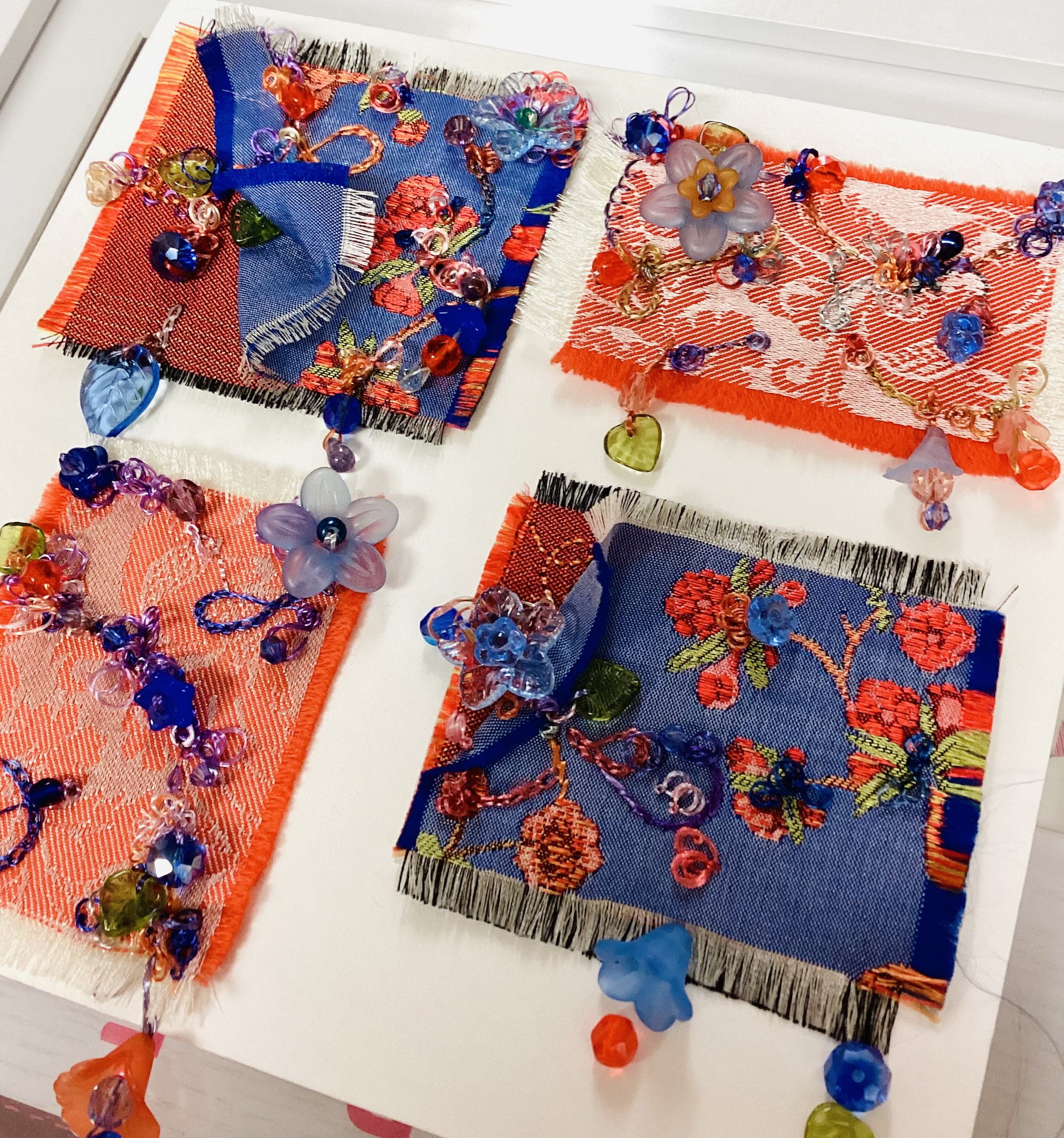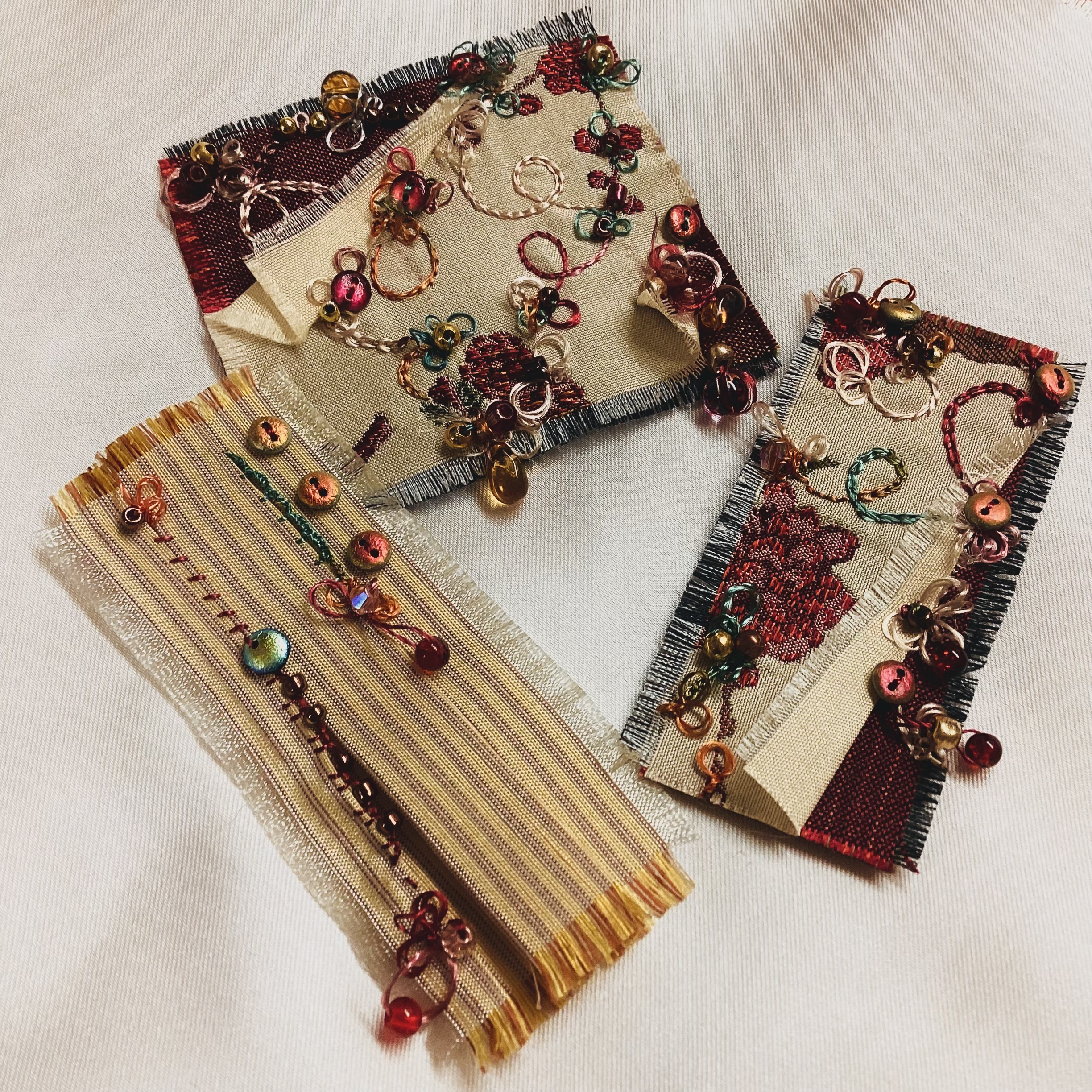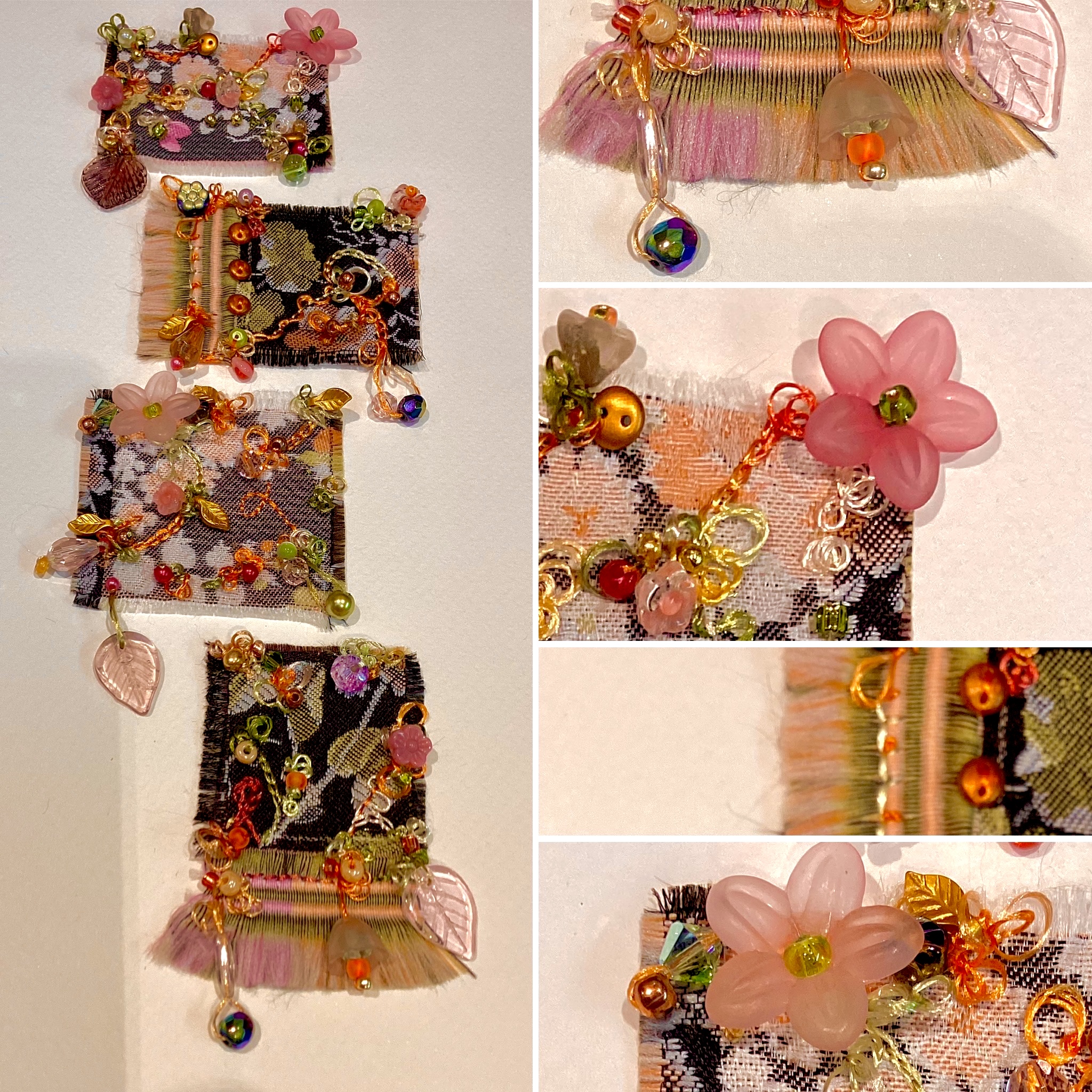 Pleating and gathering taffeta, Fabric manipulation using fascinating pocket weave brocades. Stitch weaving into jacquard fabric. Using hand embroidery and beading to embellish a weave pattern. Picot edging techniques will also be covered .There will be lots of examples to provide inspiration and to help you consider ways of compiling small sections of work to create a composition. All techniques, stitches and stages will be demonstrated.