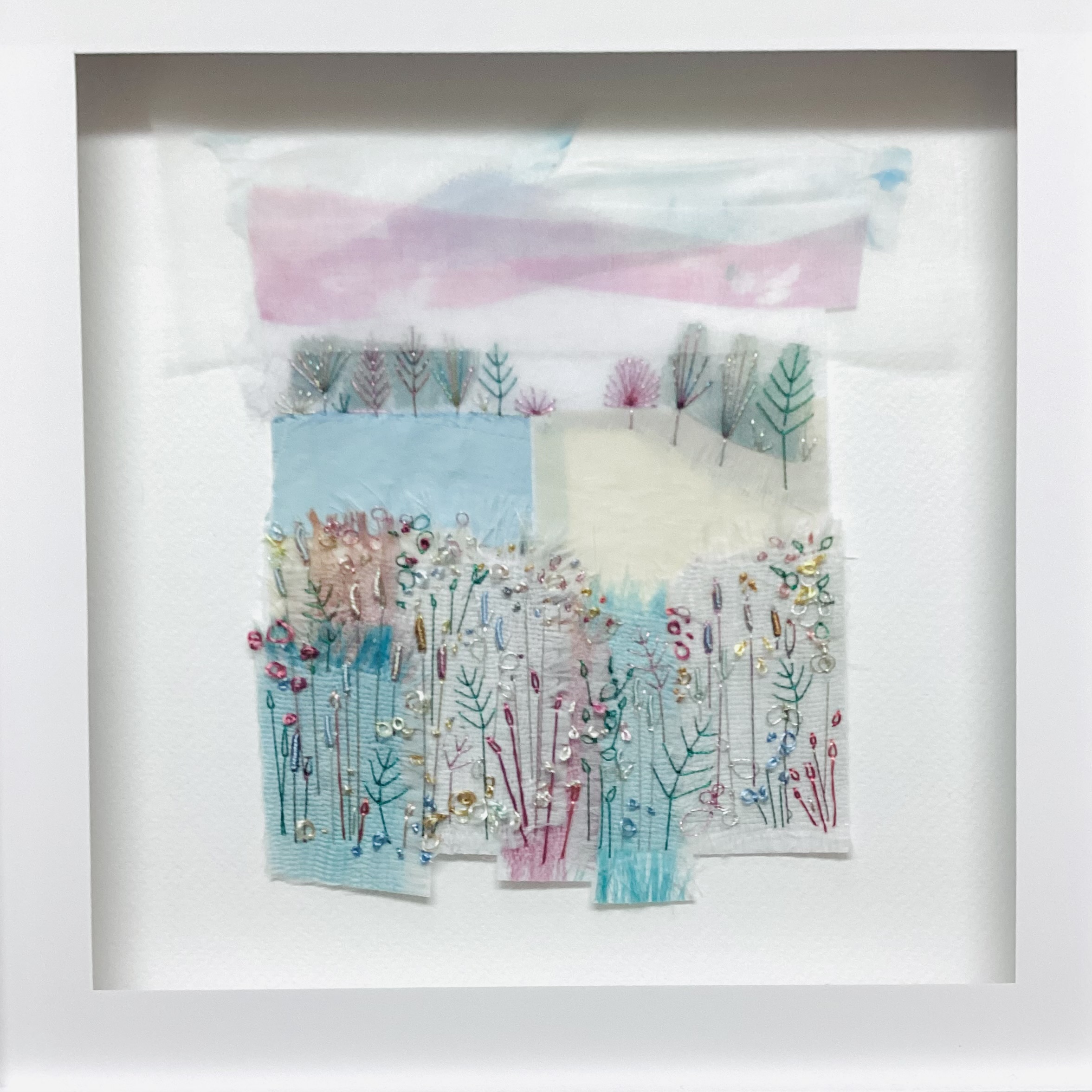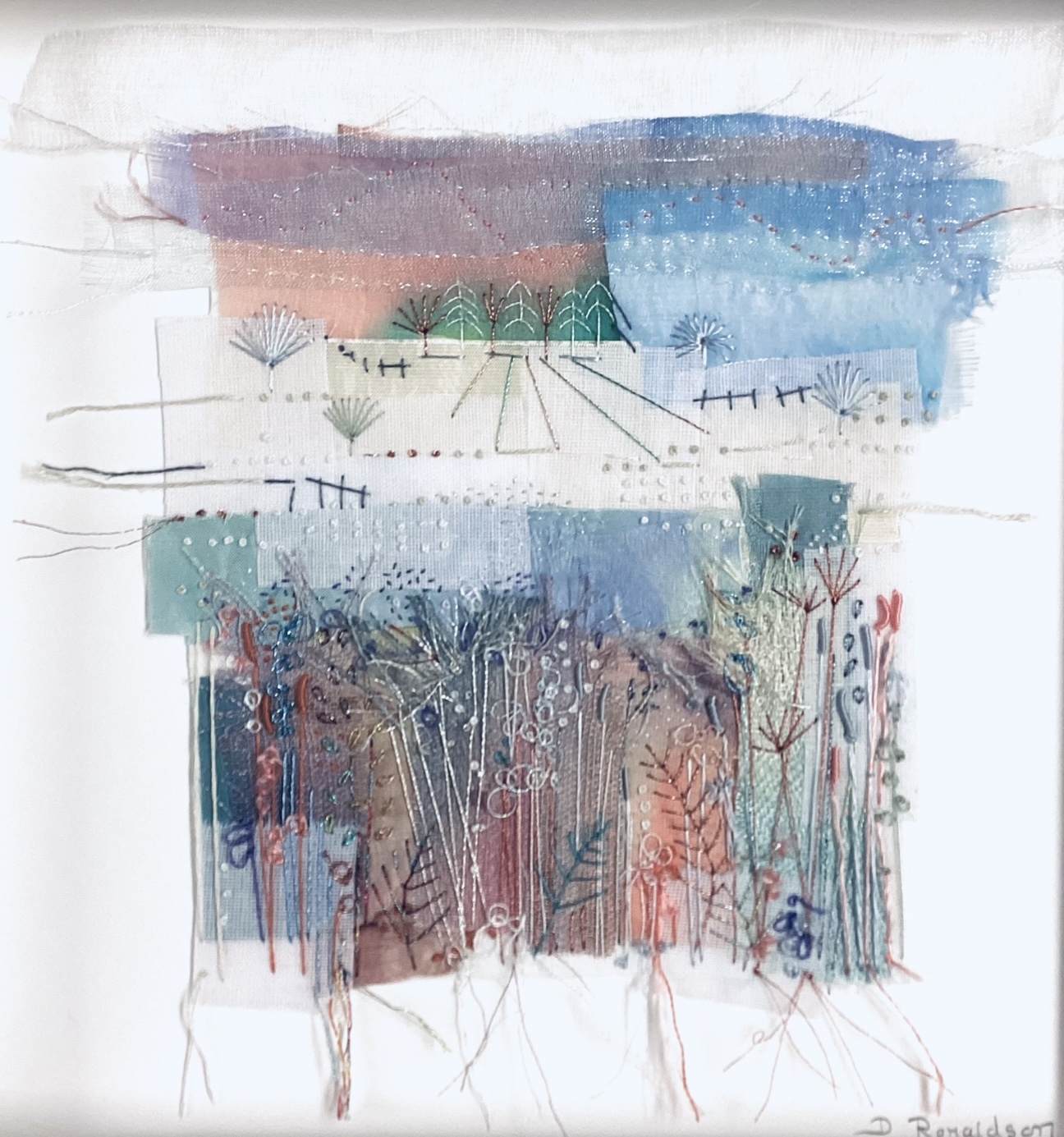 A collage and hand stitch day. The process begins with the creation of a collage using Sudbury silk in cream, white and blue tones to develop the distant landscape. Silk painted by me is used to create the foreground and the sky. Hand stitches are used to define the distant landscape and to add densely textured foreground interest.
